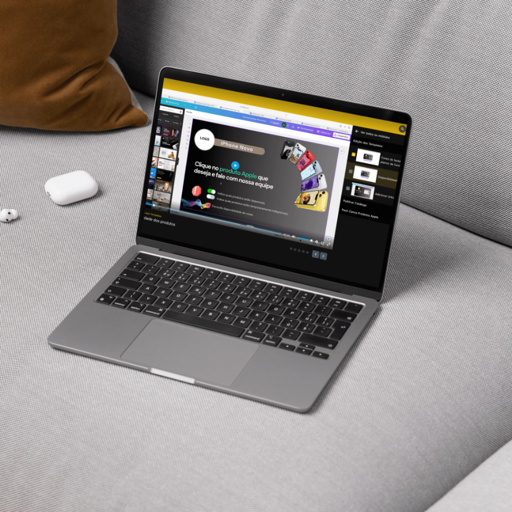 O catálogo é 100% editável no Canva, você baixa os templates e eles ficam em formato de site, onde você pode editar, inserir preços e disponibilidade dos produtos Apple de forma simples e fácil. Você aprenderá a personalizá-lo facilmente nas aulas do curso.